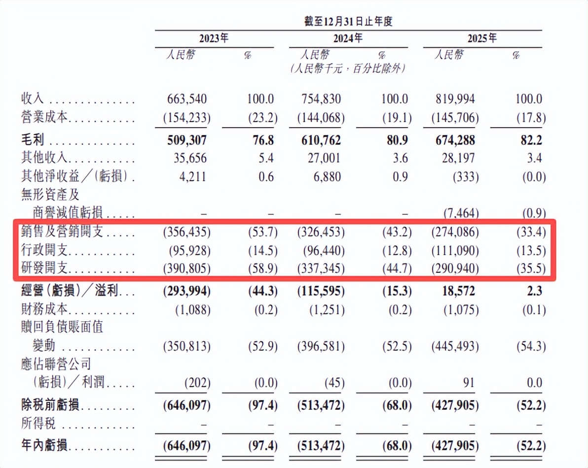 2025年,公司实现营收8.2亿元,毛利率攀升至82.2%的高位,而最关键的是经调整净利润达到5710万元,终于摆脱了长期亏损状态,这为IPO提供了最重要的一张“入场券”。