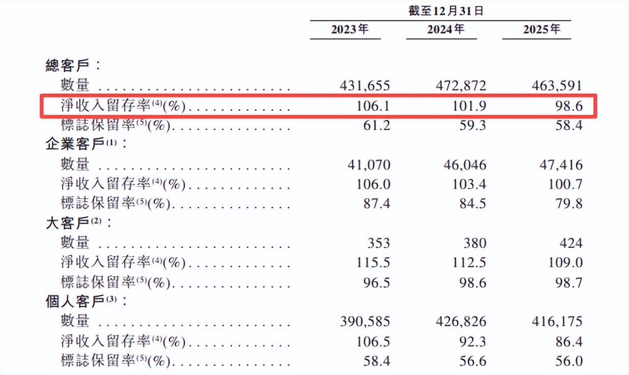 数据显示,尽管来自客户的订阅收入在增长,但总客户净收入留存率从2023年的106.1%下滑至2025年的98.6%;其中,贡献了大部分订阅收入的企业客户,占总订阅收入的比重也从2023年的87.0%下滑至2025年的84.2%。此外,新企业客户签订的订阅合约中,为期一年的比例从51.4%上升至90.2%,剩下不足10%才是一年以上的合约。