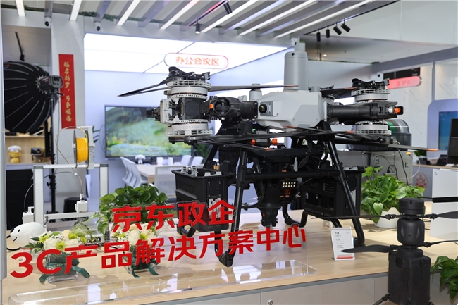 国产化区则集中展示了以联想、长城等为代表的品牌设备,彰显了对信息技术应用创新与安全可控需求的坚实支撑。大件区陈列了览众无人机、翼飞穿越机等专业级装备,展现了其在特种作业与内容创作等领域的解决方案实力;小件区则汇聚了vivo旗舰手机、韶音运动耳机等高品质个人设备;中心还设有办公会议区与直播区,共同勾勒出智慧办公、数字内容创作的未来图景。这些区域构建了从专业生产工具、核心办公设备到员工关怀产品的完整体验闭环,系统诠释了京东政企业务服务于办公日用、员工福利、生产辅助等企业全链路采购需求的综合能力。